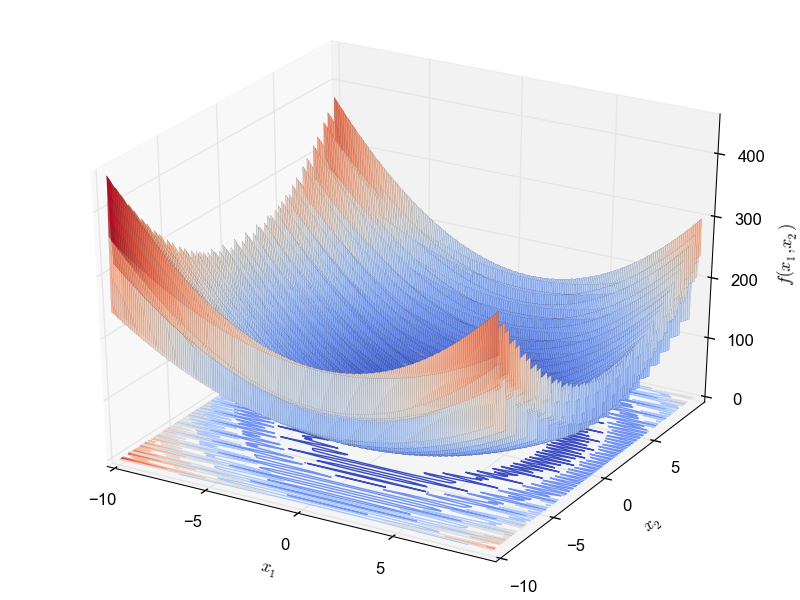 This is a highly multimodal minimization problem defined as follows: \begin{equation*} f(\textbf{x}) = 10D + \sum_{i=1}^{D}[(x_i^2 - 10cos(2\pi x_i)^2] \end{equation*} with $x_i \in [-5.12, 5.12]$ and global optimum $f(0.0,.., 0.0) = 0$