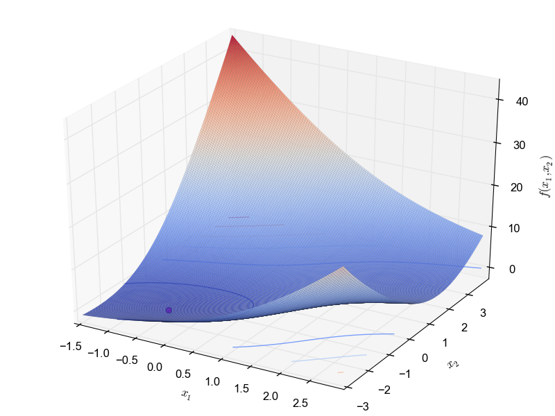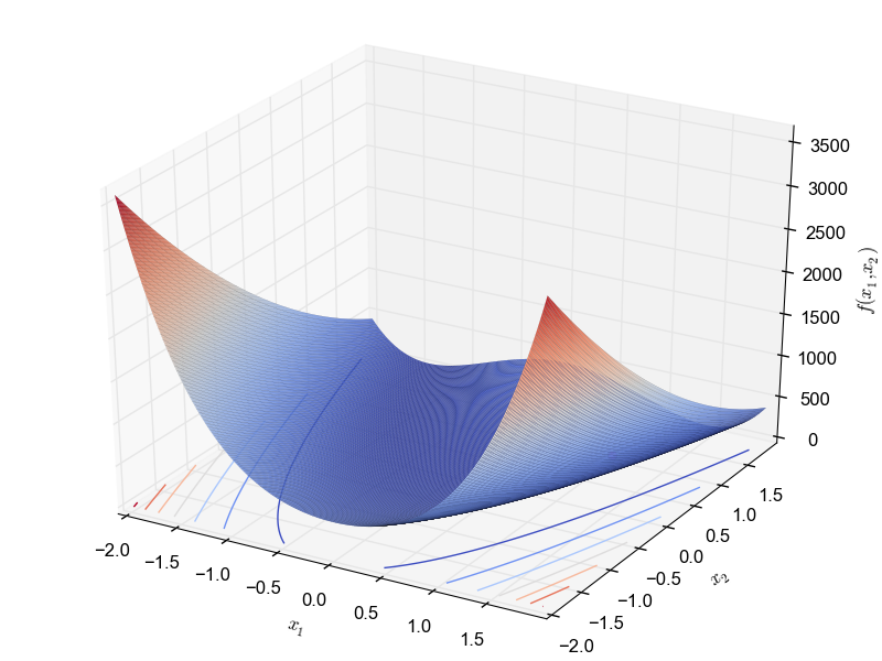 \begin{equation*} f(x_1, x_2) = \sum_{i=1}^{n-1}[100(x_i^2 - x_{i+1})^2 + (x_{i} - 1)^2] \end{equation*} with $x_i \in [-2, -2]$ The best known global optimum is: $f(1.0,.., 1.0) = 0$.