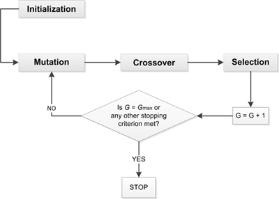 Differential evolution (DE) is a more recent stochastic population-based evolutionary method introduced by Storn and Price [1] in 1996. It follows the standard evolutionary algorithm flow with some significant differences in mutation and selection process. The simplicity of DE algorithm is based on only two tunable parameters, the mutation factor $F$ and the crossover probability $CR$. The fundamental idea behind DE is the use of vector differences by choosing randomly selected vectors, and then taking their difference as a means to perturb the parent vector with a special kind operator and probe the search space. Several variants of DE have been proposed so far [2, 3], but the following analysis is focused on the nominal approach (DE/rand/1/bin). According to this, each of the members of the population undergoes mutation and crossover. Once crossover occurs, the offspring is compared to the parent, and whichever fitness is better is moved to the next generation (selection) (see Fig. 1).
